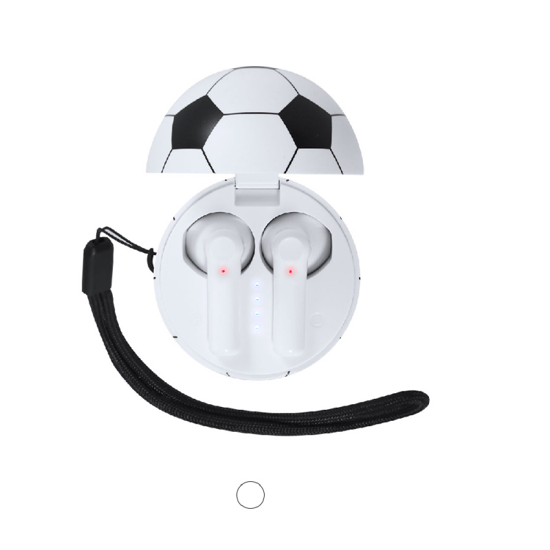Características: Auriculares con estuche de diseño de balón de fútbol. Con conexión Bluetooth® 5.3 y 3W de potencia, y batería de 200 mAh a través de cable USB-Tipo C incluido. Incluye asa de sujeción para cómodo transporte.
