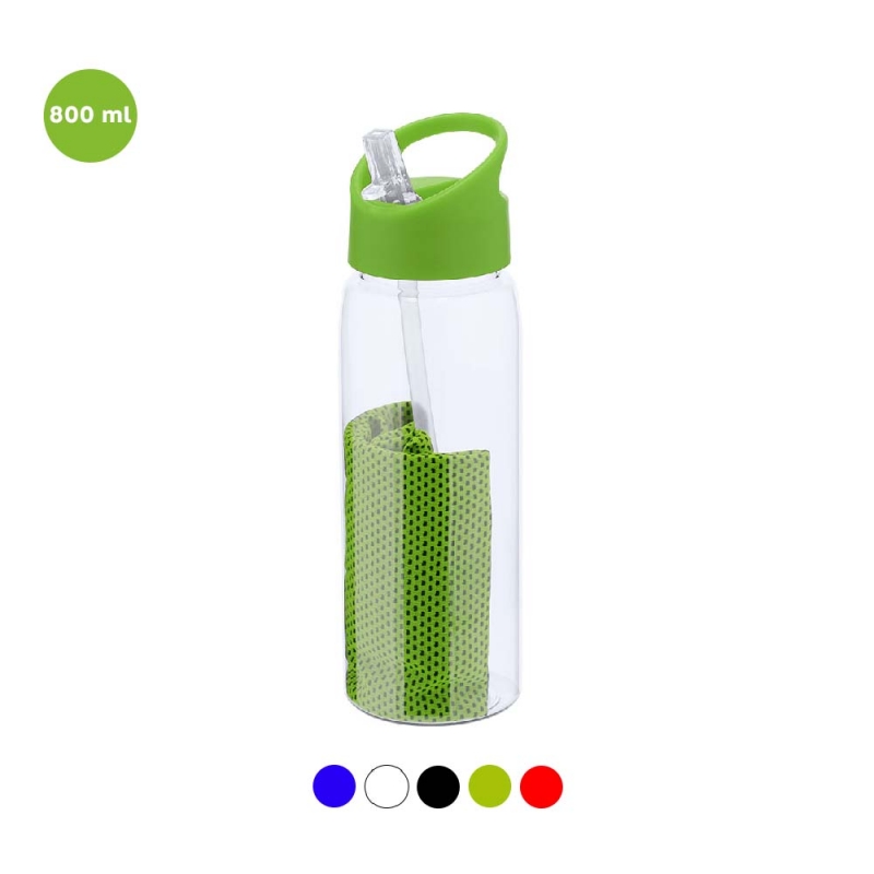 Características: Set de bidón y toalla fabricados en RPET. Bidón de 800 ml de capacidad con sistema de fácil apertura libre de BPA con dosificador de pajita y asa de transporte a juego y toalla a juego de 30x80cm.