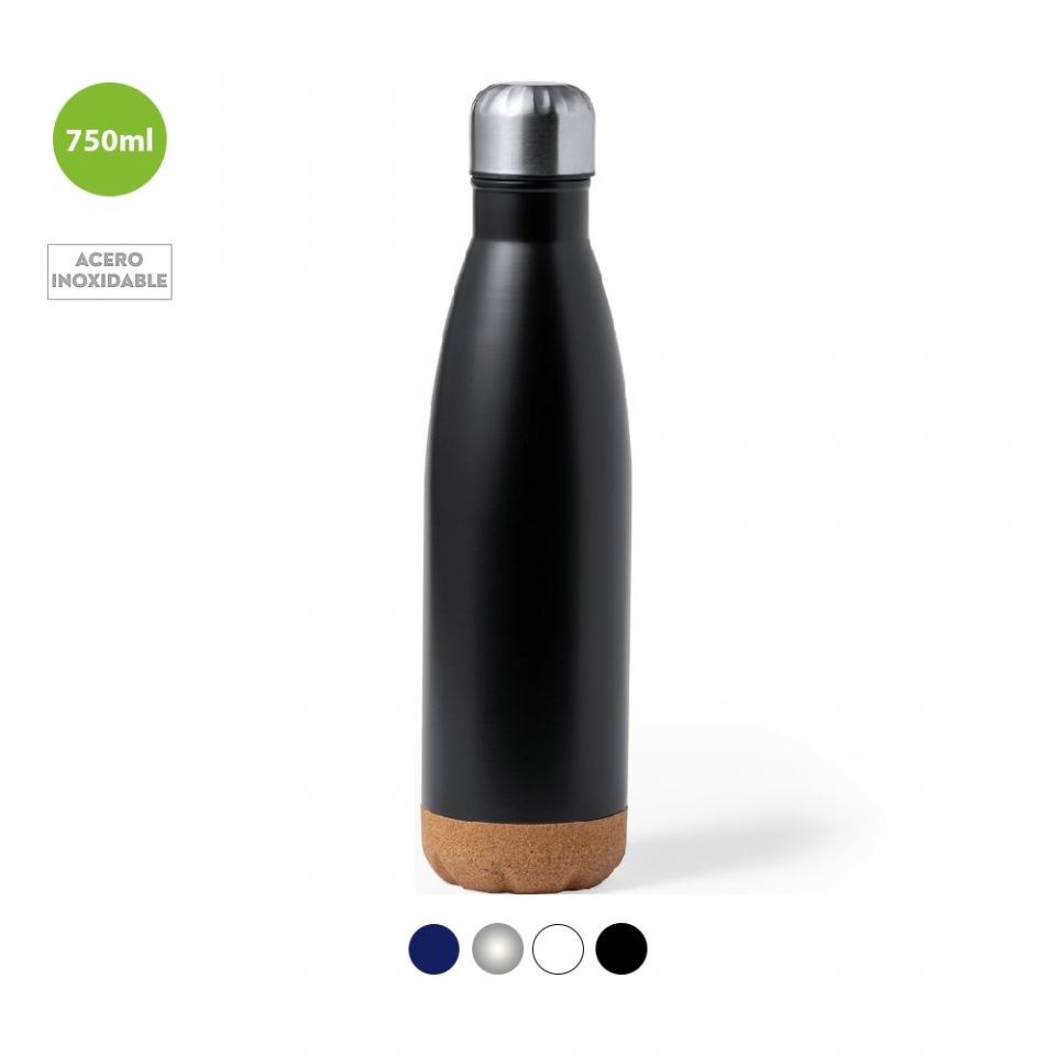 Características: Bidón de 750 ml de capacidad, fabricado en acero inox. Con base en corcho natural y tapón a rosca, libre de BPA. Disponible en variada gama de colores satinados y presentado en caja individual de diseño kraft.