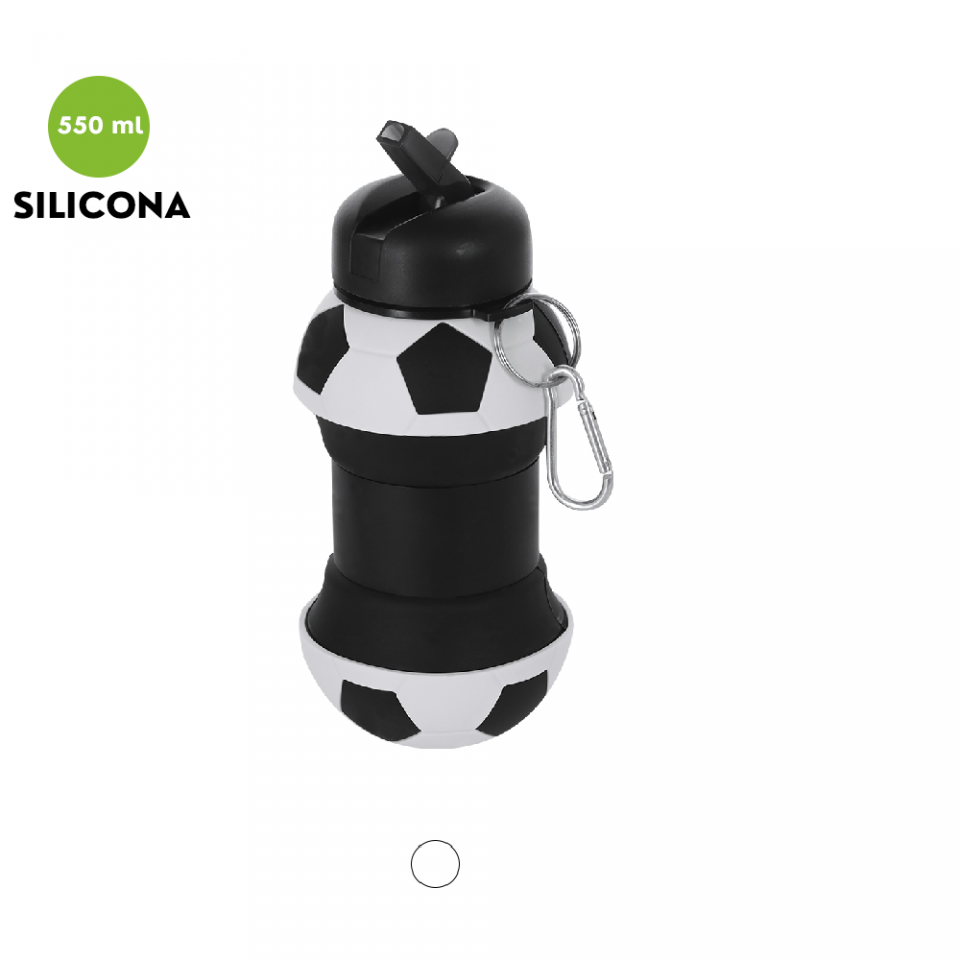 Características: Bidón plegable con diseño de balón de futbol con capacidad de 550 ml. Incluye anilla metálica con mosquetón para práctico transporte. Tapa de rosca con boquilla. Libre de BPA.