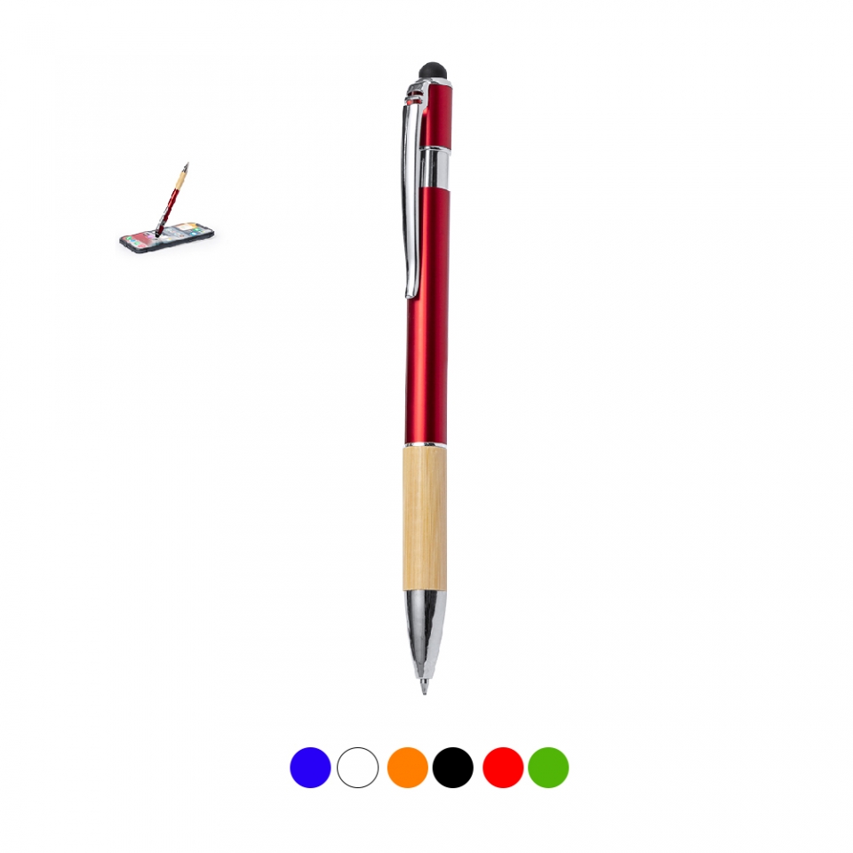 Características: Elegante bolígrafo puntero de bambú y aluminio con mecanismo pulsador. Cuerpo en resistente aluminio de acabado brillante y empuñadura en bambú con puntero en la parte superior en negro. Caña en una amplia gama de distintivos colores metálicos. Clip metálico, con pulsador retráctil y en tinta azul. Presentado en bolsa individual reciclada.