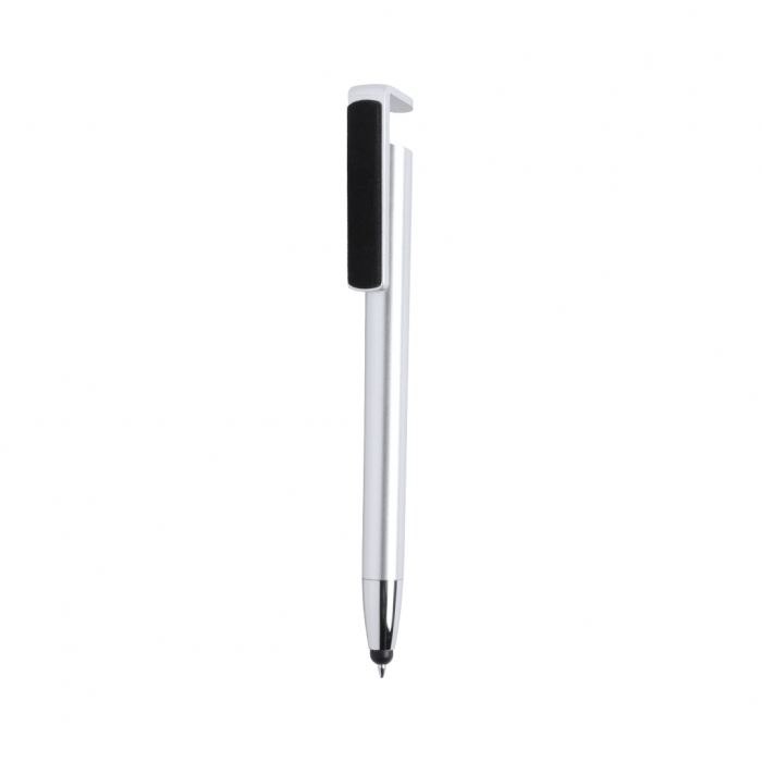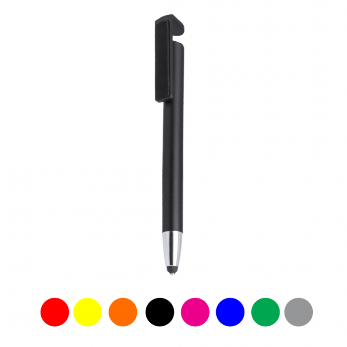 Características: Bolígrafo puntero multifunción de mecanismo pulsador en desenfadados colores y con clip de doble función especialmente diseñado para servir como soporte para dispositivo móvil y también como limpiador de pantalla. Con cuerpo en acabado metalizado, especialmente diseñado para marcaje en tampografía y tinta negra.
