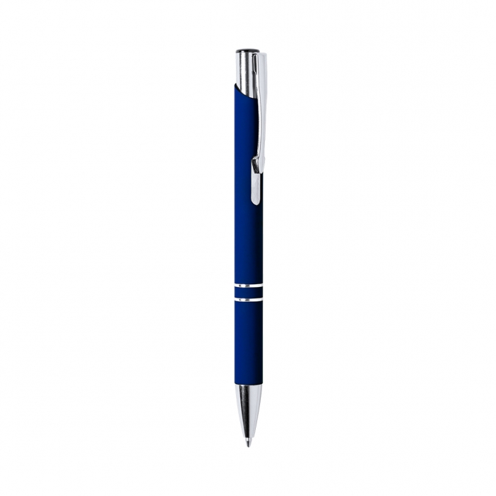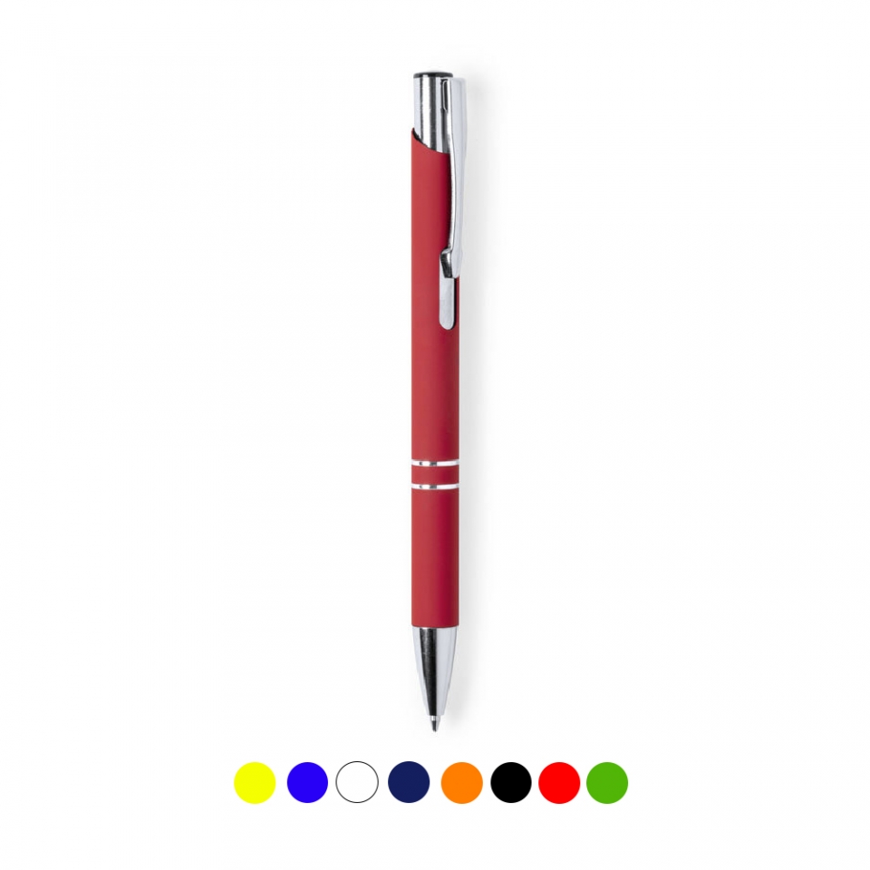 Características: Original bolígrafo de mecanismo pulsador en elegante diseño bicolor. Con cuerpo troquelado de aluminio en tacto goma de acabado mate. Especialmente diseñado para marcaje en láser y mostrar el logotipo en tono plateado. Original clip, anillas y punta en plateado. Disponible en variada gama de colores, con cartucho jumbo y tinta azul.