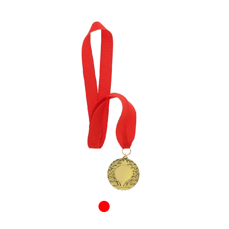Características: Medalla metálica de acabado dorado en relieve. Incluye cinta de poliéster en rojo.
