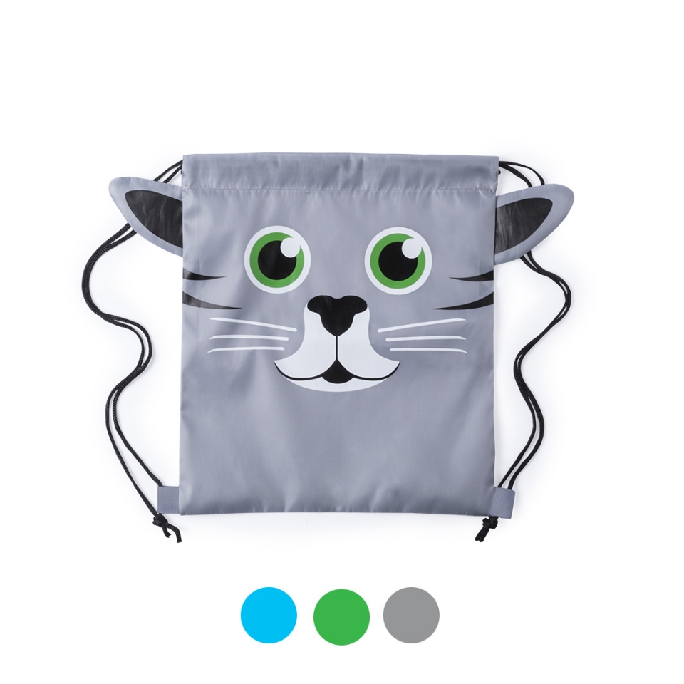 Características: Mochila de cuerdas plegable para niño, en suave poliéster 210T de originales diseños con animalitos. Con cuerdas autocierre en color negro y esquinas reforzadas. Plegado de pequeño tamaño.