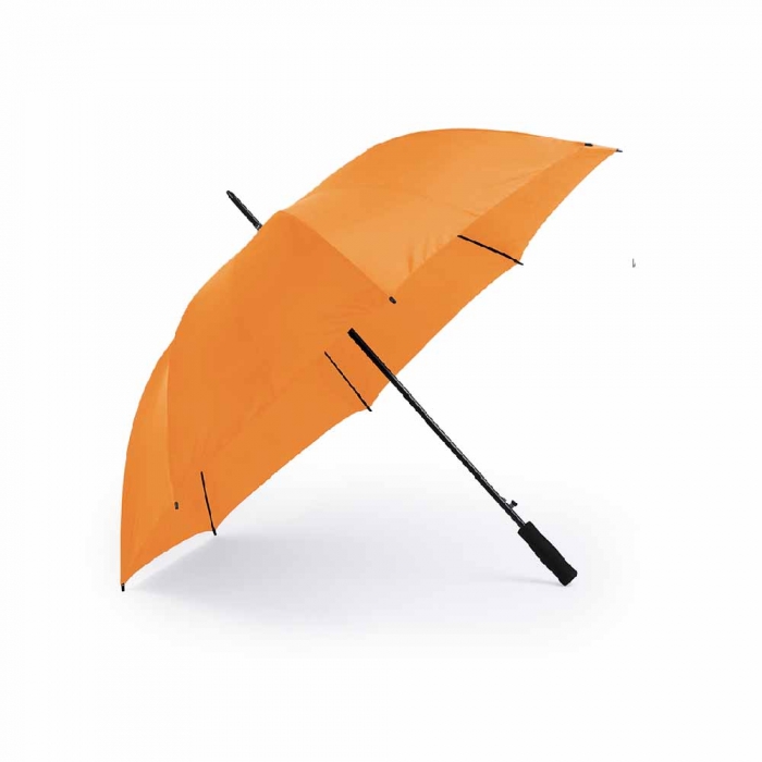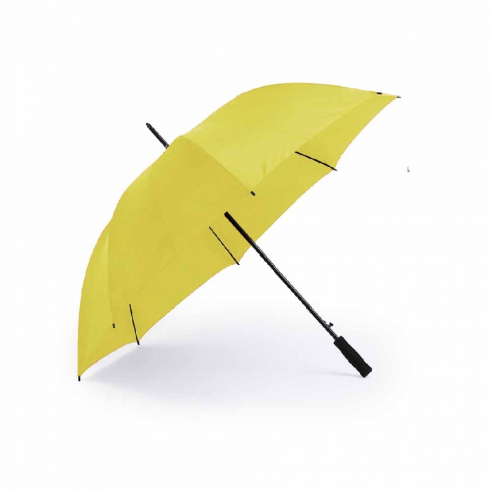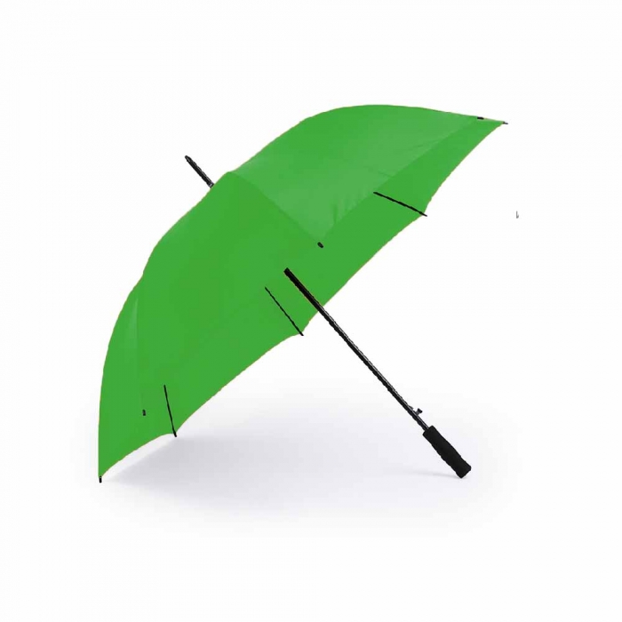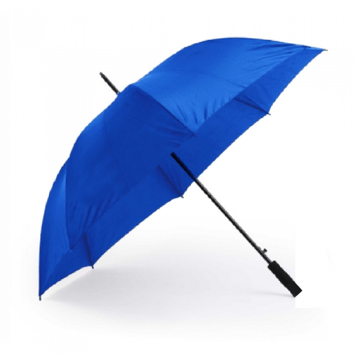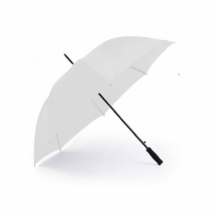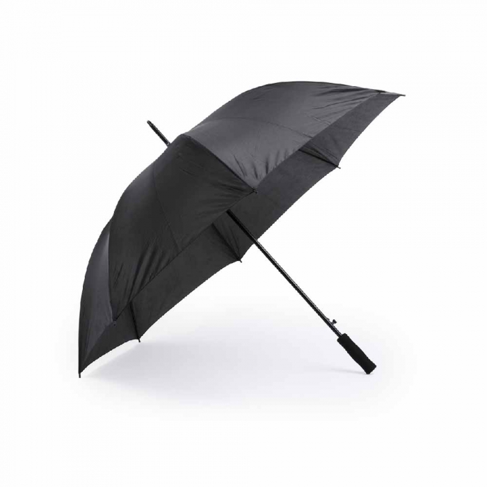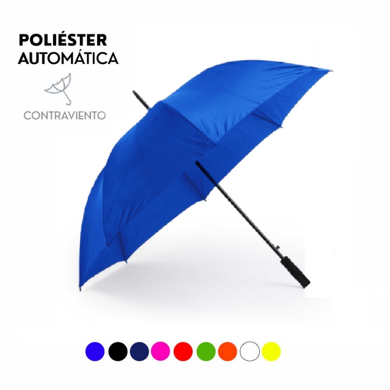 Características: Paraguas de 8 paneles tamaño XL -130cm diámetro- con sistema antiviento. Apertura automática, en resistente poliéster y con varillas de fibra en color negro. Con mango acolchado de EVA y cierre de velcro.