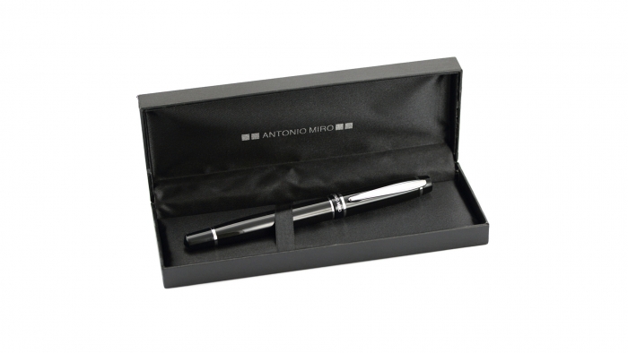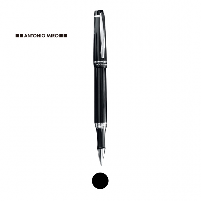 Características: Roller de capucha de Antonio Miró en elegante diseño bicolor y suave cuerpo metálico en sobrio color negro. Con logotipo de la marca bajo la anilla, clip y punta en acabado plateado brillante. Presentado en estuche individual en color negro con logotipo de la marca. En tinta azul.