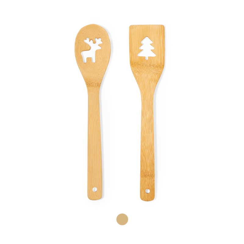 Características: Original set de cocina con motivos navideños troquelados. Incluye cuchara y paleta fabricadas en bambú pulido.