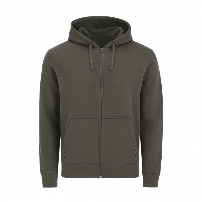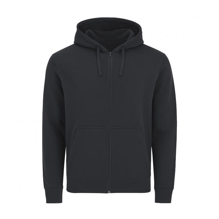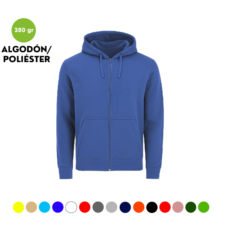 Características: Sudadera unisex con capucha forrada a tono. Confeccionada en algodón y poliester en suave felpa perchada de 280 g/m2. Cierre frontal de cremallera completa a tono. Con cordón ajustable y ojales metálicos a juego. Bolsillo tipo canguro. Cubrecosturas en el cuello. Puños y la cintura en punto canalé 1x1 con elastano para mayor ajuste y confort.