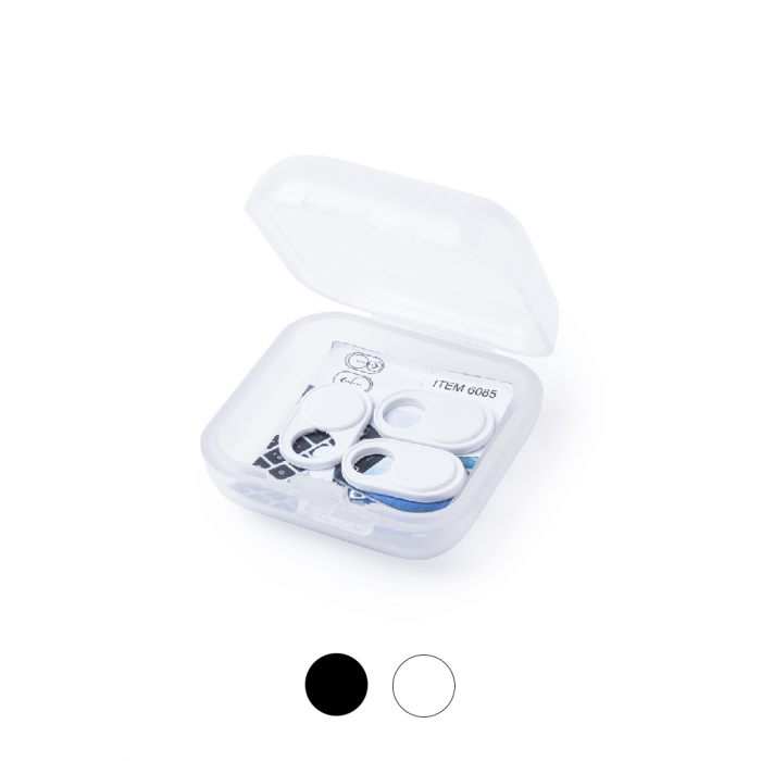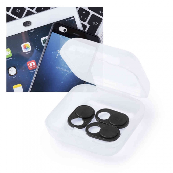 Características: Tapa para cámara de dispositivo móvil para proteger la privacidad. En tamaño ultra compacto y servida en estuche individual de achado translúcido . Disponible en colores blanco y negro, set presentado en bolsita individual con cartulina de diseño.