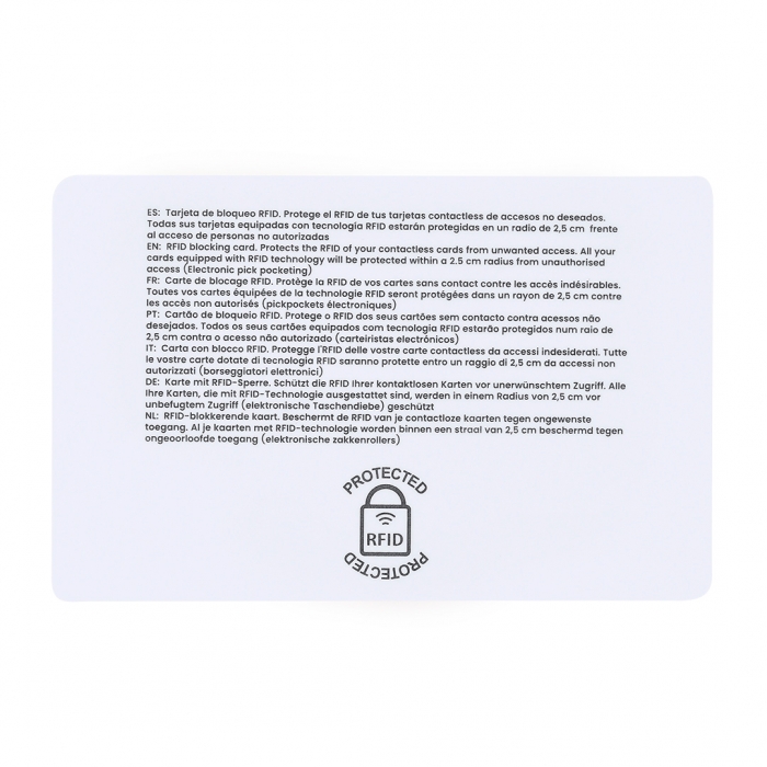 Características: Tarjeta con sistema de protección RFID, diseñada para bloquear accesos no autorizados a tarjetas contactless. Funciona mediante un campo electromagnético que interfiere con las señales de lectura, protegiendo las tarjetas ( bancarias, de crédito, transporte público, etc.) ubicadas en un radio de entre 2 y 3 cm alrededor de la tarjeta.